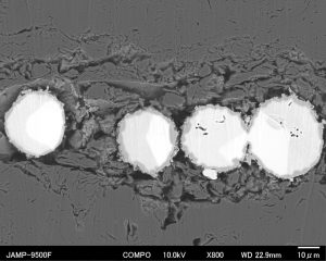 SEM(走査電子顕微鏡)はタングステンフィラメントの熱電子銃タイプです。汎用型で非常に使いやすい仕様になっています。 分解能は最小で3.0nm(30kV)、加速電圧は0.3kV~30kVまで可変です。SEMとして二次電子像を取得出来る他、反射電子像(COMPO像、TOPO像)の観察も可能です。 EDS(エネルギー分散型X線分析装置)を装備しており、試料表面の元素同定、定量を行えます。測定法には点分析、エリア分析、線分析、マッピングがあります。